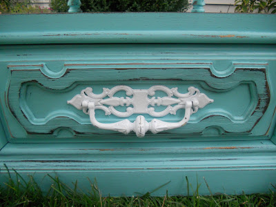I was going to keep the original hardware until I realized it wasn't the original hardware and then I thought--why should I keep it if it's ugly and it's not the original? After all this poor thing has been through I thought she at least deserved some pretty pulls--so that's what she got! The top was just as bad as the rest of it. Sanding just wasn't going to do the job and I knew I wanted to stain it so it had to look good. Bless Craig's heart--he took the grinder to it. DIY'ers: this is not recommended! It took some heavy sanding after that, but I think it turned out great. I also love that you can see where they nailed the top down. That's old school! :)