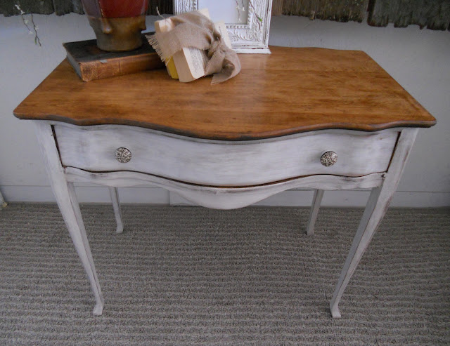 Sometimes when I see a piece of furniture I know exactly what I want it to look like. This sweet little table was one of those. I absolutely love the curvy top and drawer, but those hideous pulls grabbed your focus. I love the layered and textured look some old world pieces have and I thought she would look perfect that way.