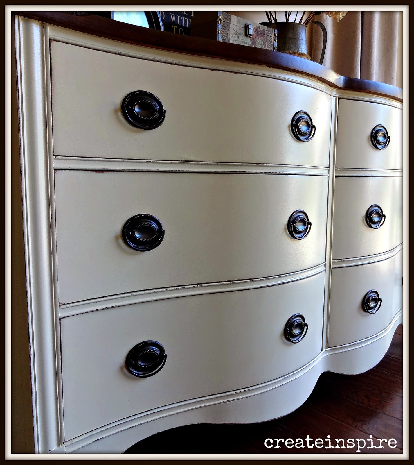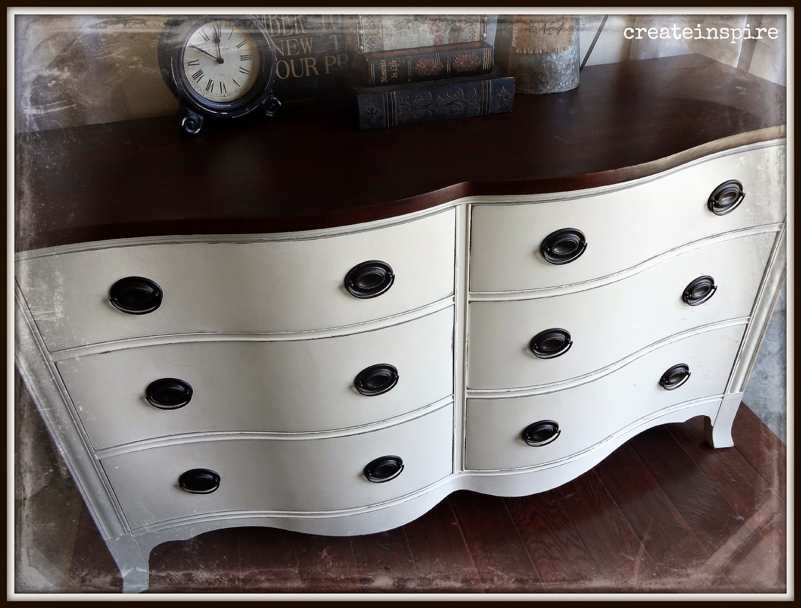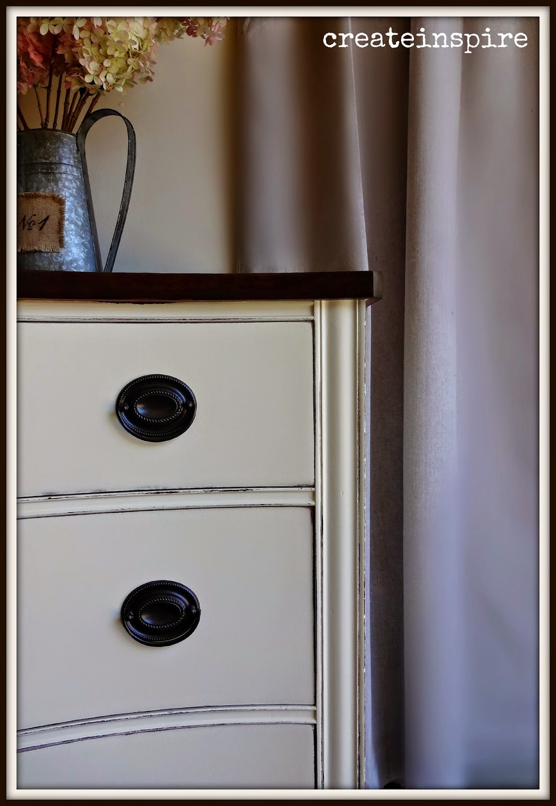 I just love the contrast between a lighter color paint and a dark top. The dark wood from the top and peeking through the paint really does something for the color. Paint color can look flat if there's nothing contrasting it. That's why I love leaving the top (or drawer fronts) natural if I can, or using white on the details.
