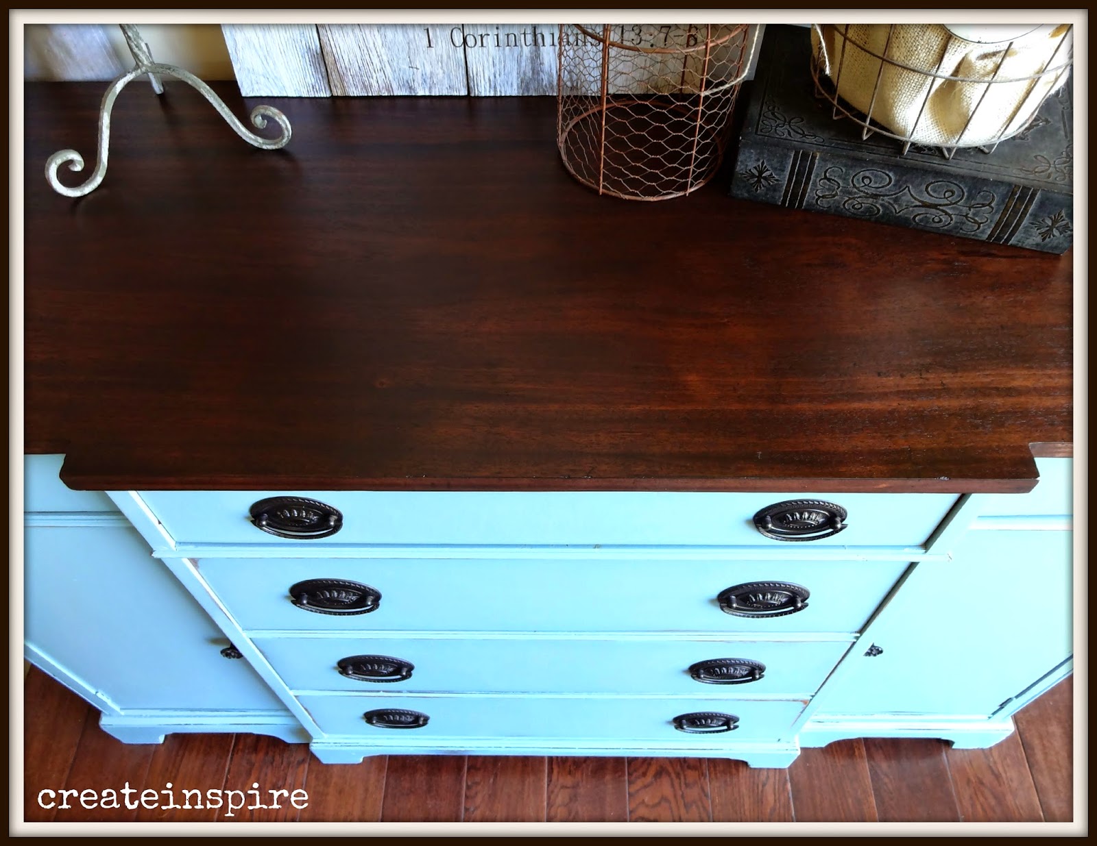 She chose Interesting Aqua from Sherwin Williams. You know how I feel about these soft blue/greens. LoVe them! It always amazes me how paint colors can look so different depending on what light they're in. I had to hold up the color card to the piece when I was finished with it to see if it really was the same color (and it was)! It looks blue, soft turquoise, or a little gray depending on the light.