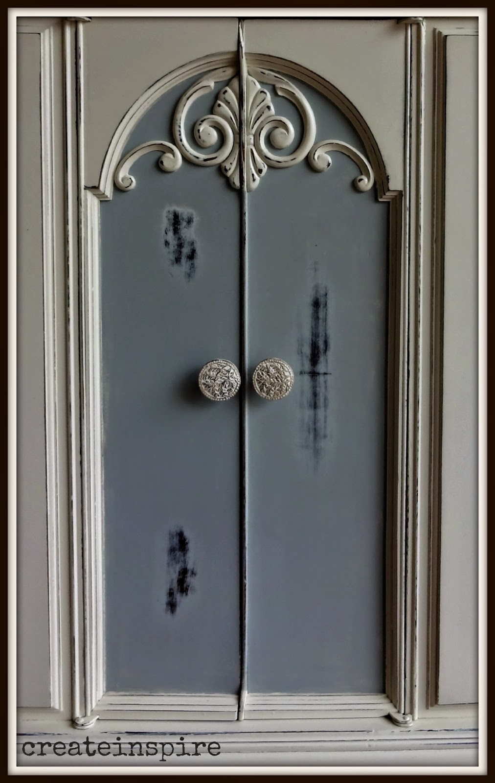 I love the back piece on this stand too! I wet distressed this piece so I didn't take off the dark finish under the paint.