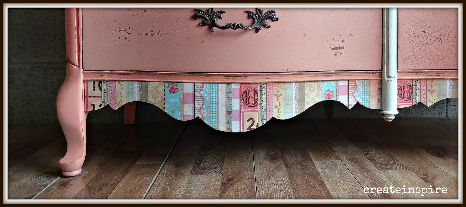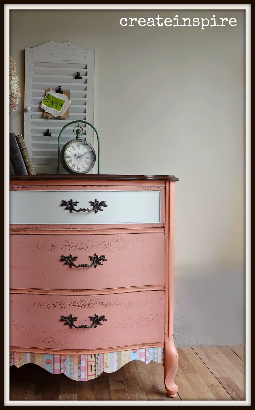 I decided I would do just the drawer fronts with the milk paint and do the body in my regular ProClassic and just have it color matched. When it all dried and I finished up the drawer fronts I put them in the dresser and they looked good except the ProClassic had dried just a tad bit more orange than the Coral Bells. You couldn't tell on the thin pieces, but the bottom was very obvious. AND, the drawers chipped beautifully (which is what I was hoping for), but the latex on the skirt (which is right next to the bottom drawers) was smooth as butter. It just didn't look right. I tried chipping it with the putty knife, but it didn't look as natural as the drawers and I couldn't live with it. So, I sat on my garage floor until I had an epiphany and I remember I had this cute paper from a project two years ago. Perfect!